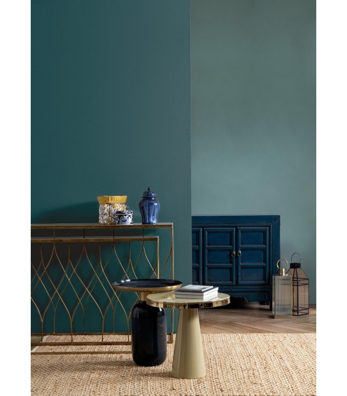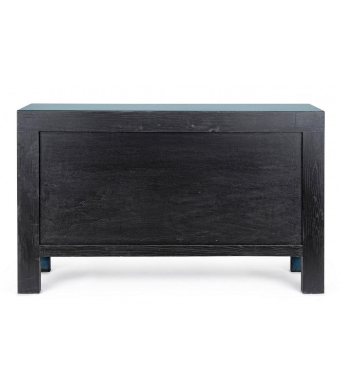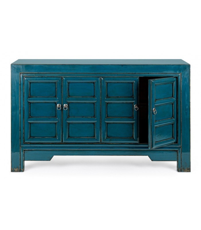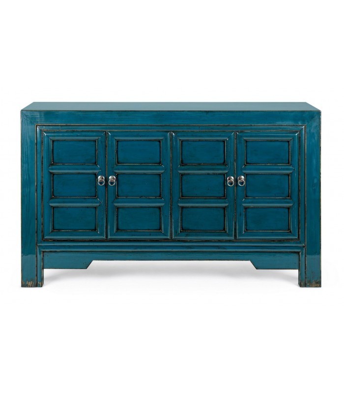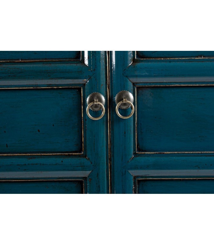 Credenza Jinan 4 ante – Colore Blu Patinato Struttura in legno di olmo Finitura lucida e patinata a base d'acqua 4 ante con eleganti maniglie in rame Colore: Blu patinato Stile: Contemporaneo con richiami etnici/orientali Brand: Bizzotto Homemotion Dimensioni: L. 133 x P. 40 x H. 82 cm
