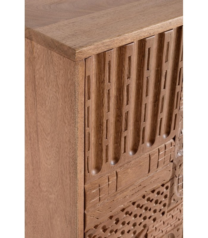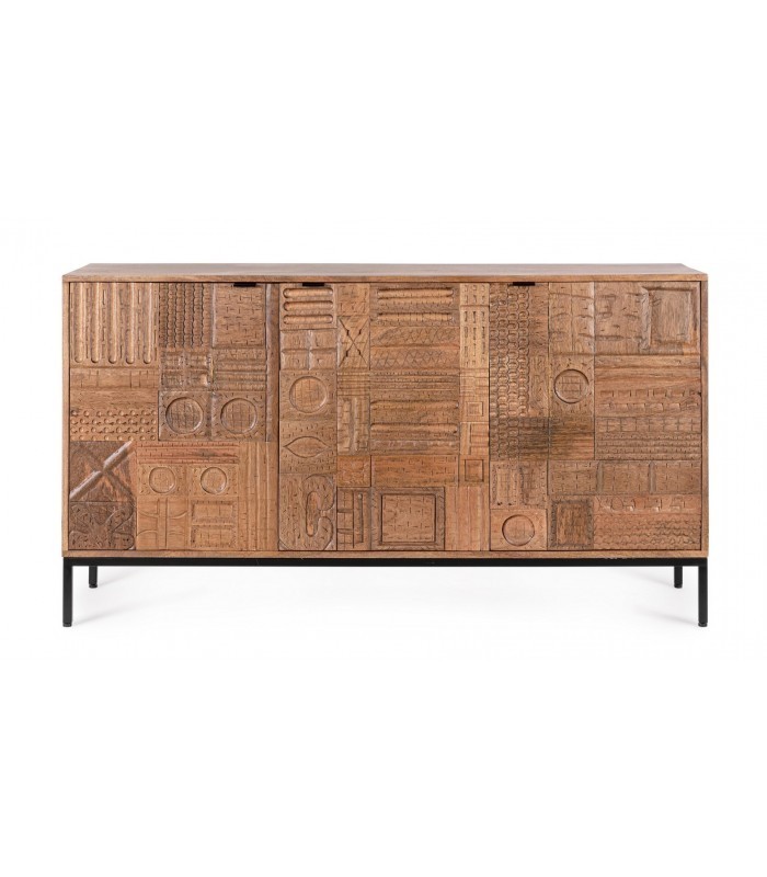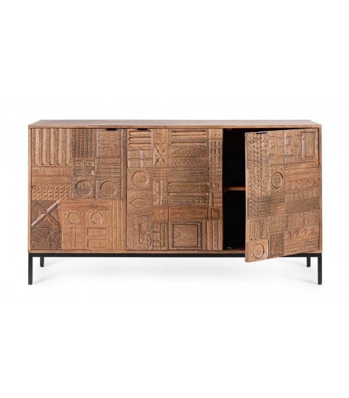 Credenza in Legno Massiccio Mango Intarsiato - Stile Eclettico | Bizzotto Un mobile che è una vera opera d'arte: questa credenza firmata Bizzotto unisce artigianalità, design e funzionalità. La struttura è realizzata in legno massiccio di mango, con frontali intarsiati a mano che rendono ogni pezzo unico e irripetibile. I dettagli geometrici e decorativi creano un forte impatto visivo, perfetto per arricchire ambienti dallo stile eclettico, boho chic o industriale caldo. Le tre ante con ripiani interni offrono ampio spazio contenitivo per organizzare oggetti, stoviglie o tessili. Il tutto è impreziosito da maniglie e gambe in acciaio verniciato nero, che donano stabilità e un tocco contemporaneo. La finitura protettiva a base di nitrocellulosa esalta le venature naturali del legno e dona un aspetto caldo e autentico. Caratteristiche tecniche: Struttura: legno di mango massello Schienale: MDF Gambe e maniglie: acciaio verniciato nero (da assemblare) Finitura: vernice a base di nitrocellulosa Dimensioni: L 145 x P 42 x H 80 cm Ante intarsiate artigianalmente 3 ante con ripiani interni Consigli di abbinamento: • Tavoli in legno grezzo o con dettagli in ferro • Complementi in tessuti naturali (cotone, lino, juta) • Specchi o quadri con cornici nere o in metallo dorato • Lampade in ottone o vetro fumé • Tappeti con motivi geometrici o etnici Perfetta per la zona living, sala da pranzo o persino l'ingresso, dove diventerà protagonista con il suo carattere deciso e l’estetica sofisticata. Spedizione gratuita – Prodotto da assemblare parzialmente.
