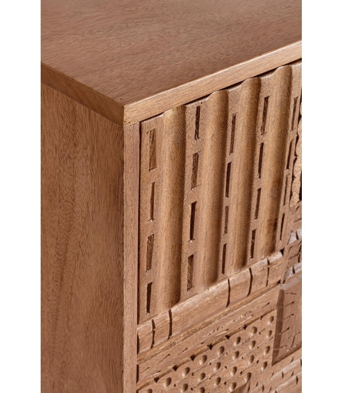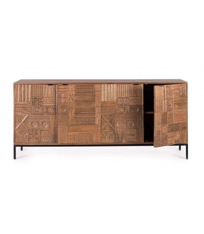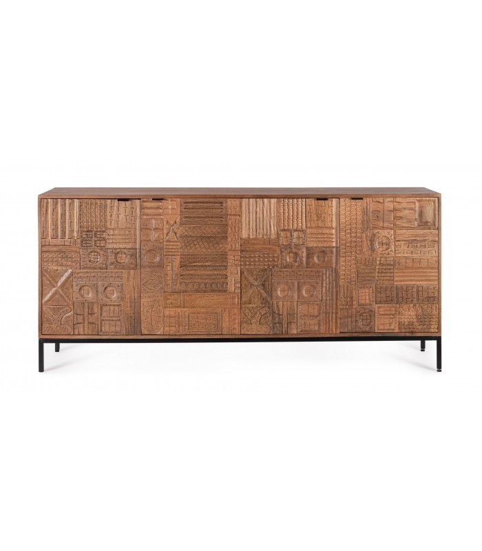 Credenza in Legno Massiccio Mango Intarsiato - Stile Eclettico | Bizzotto Un mobile che è una vera opera d'arte: questa credenza firmata Bizzotto unisce artigianalità, design e funzionalità. La struttura è realizzata in legno massiccio di mango, con frontali intarsiati a mano che rendono ogni pezzo unico e irripetibile. I dettagli geometrici e decorativi creano un forte impatto visivo, perfetto per arricchire ambienti dallo stile eclettico, boho chic o industriale caldo. Le tre ante con ripiani interni offrono ampio spazio contenitivo per organizzare oggetti, stoviglie o tessili. Il tutto è impreziosito da maniglie e gambe in acciaio verniciato nero, che donano stabilità e un tocco contemporaneo. La finitura protettiva a base di nitrocellulosa esalta le venature naturali del legno e dona un aspetto caldo e autentico. Caratteristiche tecniche: Struttura: legno di mango massello Schienale: MDF Gambe e maniglie: acciaio verniciato nero (da assemblare) Finitura: vernice a base di nitrocellulosa Dimensioni: L 145 x P 42 x H 80 cm Ante intarsiate artigianalmente 3 ante con ripiani interni Consigli di abbinamento: Tavoli in legno grezzo o con dettagli in ferro Complementi in tessuti naturali (cotone, lino, juta) Specchi o quadri con cornici nere o in metallo dorato Lampade in ottone o vetro fumé Tappeti con motivi geometrici o etnici Perfetta per la zona living, sala da pranzo o persino l'ingresso, dove diventerà protagonista con il suo carattere deciso e l’estetica sofisticata. Spedizione gratuita – Prodotto da assemblare parzialmente.