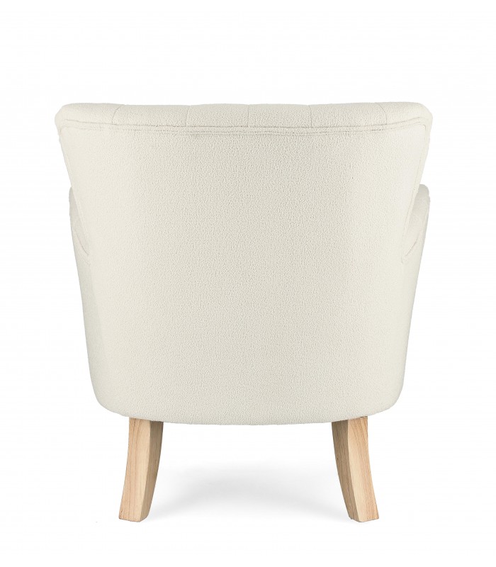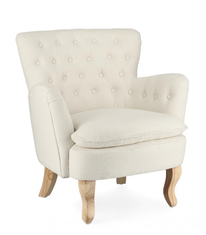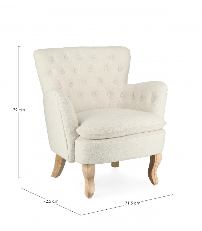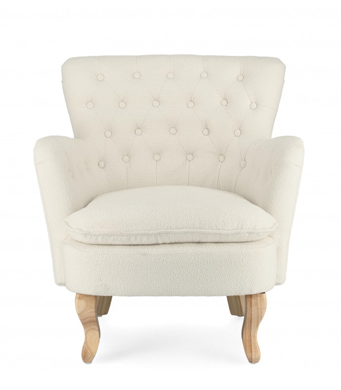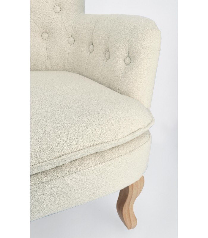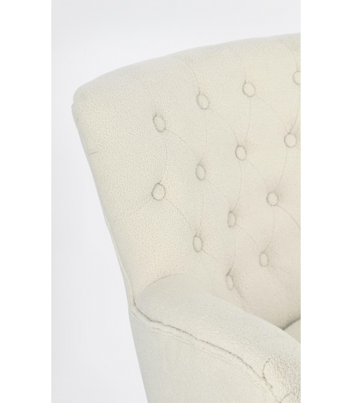 La Poltrona Orlins è l'incontro perfetto tra stile classico e comfort moderno. Caratterizzata da un elegante rivestimento in tessuto bouclé color panna e da una raffinata lavorazione capitonné, Orlins si distingue per la sua linea sofisticata e senza tempo.