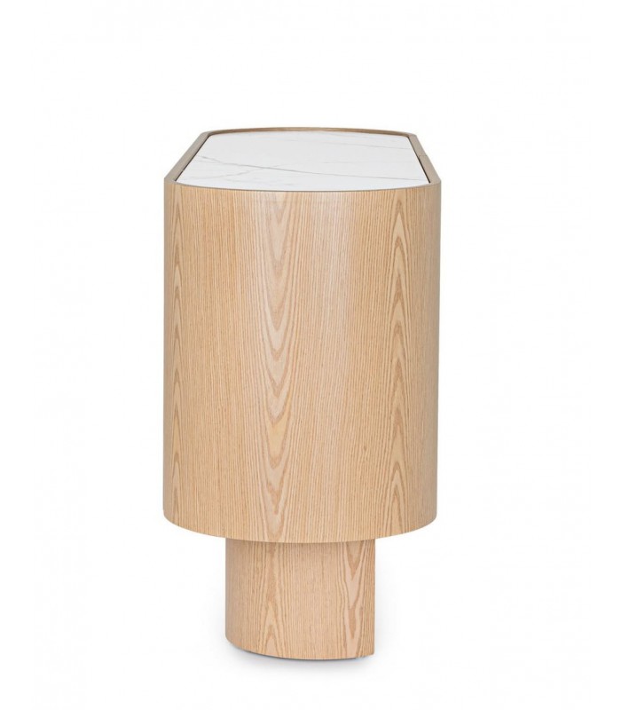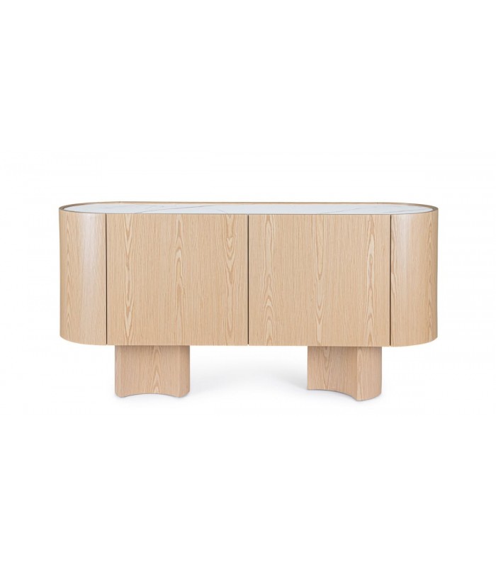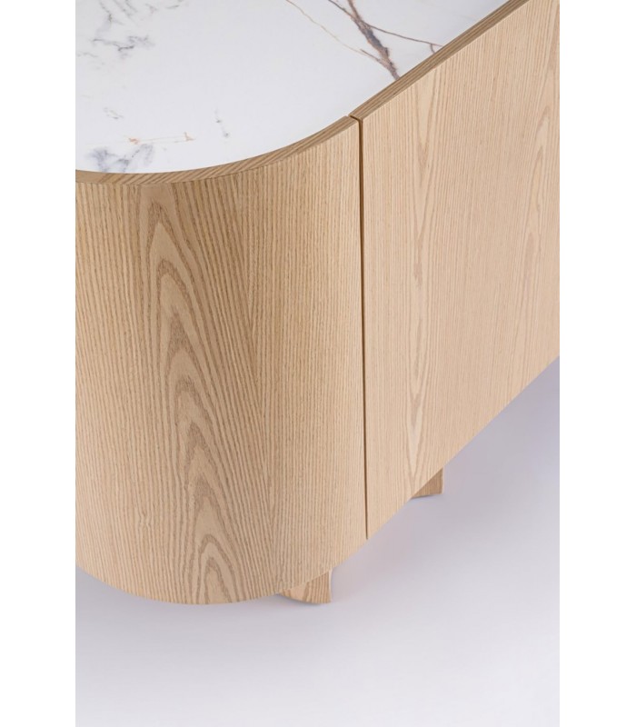 La credenza 2 ante OTILIA OAK è la soluzione ideale per chi cerca un arredo compatto ma dall’alto impatto estetico. Grazie al suo design lineare e all’attenta scelta dei materiali, unisce raffinatezza, praticità e qualità. La struttura in MDF impiallacciato rovere regala calore e naturalità, mentre il piano in pietra sinterizzata, lavorata ad alte temperature, conferisce resistenza e un elegante effetto marmo, perfetto per ambienti moderni. La finitura in vernice poliuretanica assicura durata e protezione nel tempo. Le due ante con cerniere a chiusura ammortizzata celano un vano interno con mensola, ideale per organizzare al meglio stoviglie, libri o oggetti decorativi. I piedini, da assemblare, donano stabilità e leggerezza visiva. Consigli di stile: Grazie al suo formato compatto, è perfetta anche per spazi ridotti come ingressi, corridoi o living minimalisti. Il contrasto tra il rovere naturale e la pietra chiara la rende ideale da abbinare a palette neutre, arredi in metallo nero o complementi in vetro. Un vaso decorativo o una lampada da appoggio completano il look con stile.