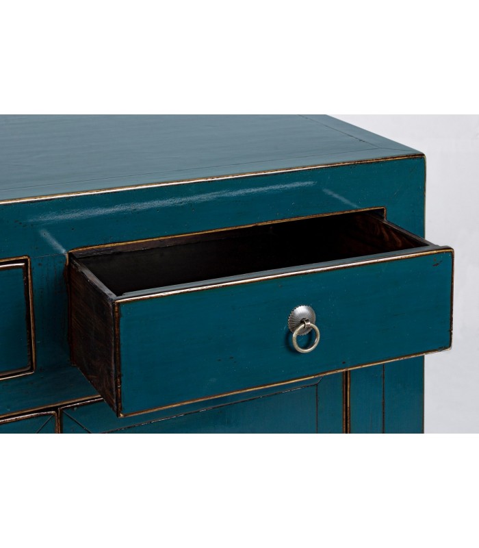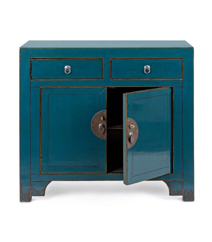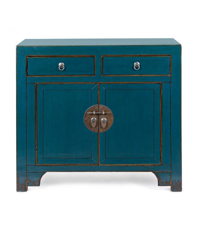La credenza JINAN blu 2 ante e 2 cassetti è un pezzo dal carattere deciso e ricercato, pensato per chi ama mobili che raccontano una storia. Realizzata in legno di olmo riciclato, è un’ottima scelta per un arredamento sostenibile e di qualità. Lo schienale e i pannelli interni sono in compensato, mentre la finitura lucida e patinata a base d’acqua esalta le sfumature del blu, conferendo al mobile un aspetto vissuto ed elegante. Le maniglie in rame aggiungono un dettaglio raffinato e originale. I due cassetti superiori sono pratici per piccoli oggetti, mentre le ante offrono uno spazio contenitivo versatile. Consigli di stile: Perfetta in un ambiente vintage, eclettico o industriale, la credenza JINAN si abbina a pareti neutre per risaltare con il suo colore intenso. Ideale per il soggiorno, l’ingresso o persino la camera da letto. Valorizzala con decorazioni in metallo, vasi in ceramica o specchi anticati per un effetto autentico e scenografico.