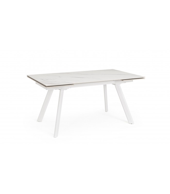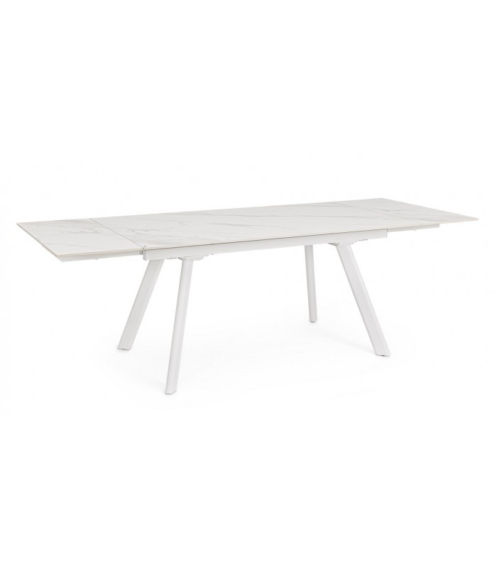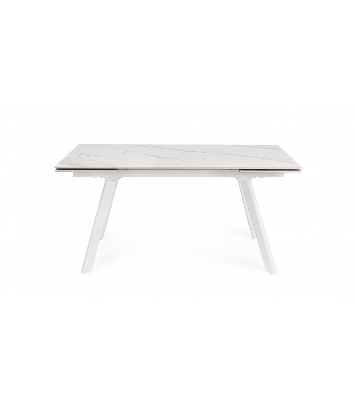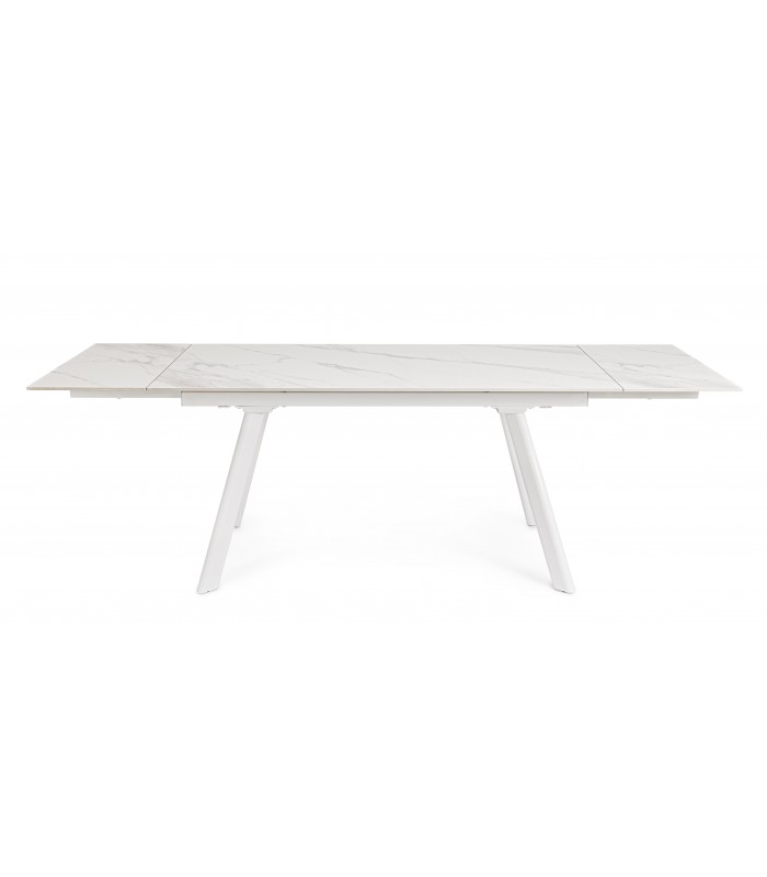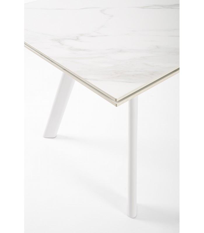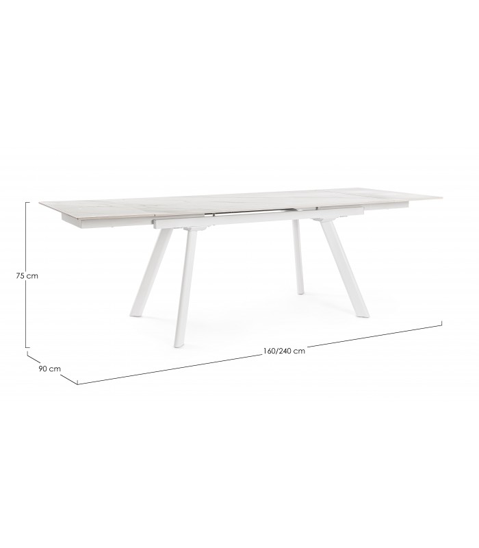 Il piano in gres porcellanato effetto marmo bianco opaco, elegante e resistente, dona luminosità all’ambiente, mentre la base in acciaio verniciato a polvere epossidica garantisce solidità e un tocco industrial-chic.