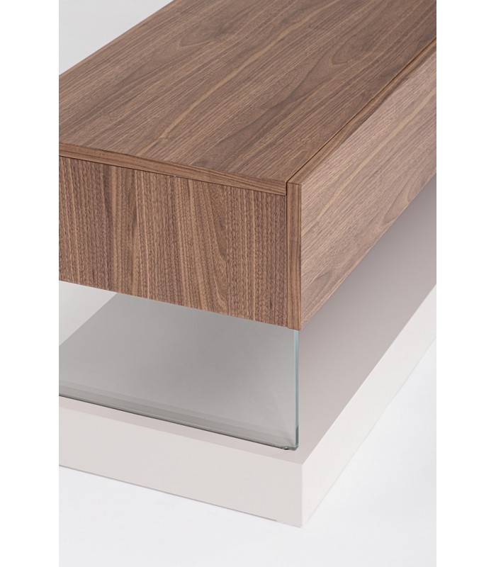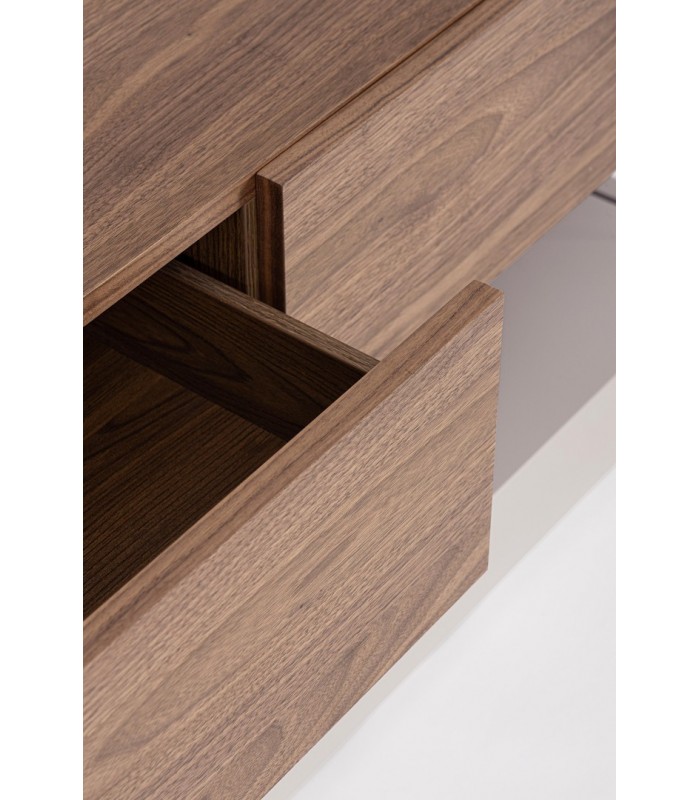 La struttura è realizzata in MDF impiallacciato in legno di noce, con finitura protettiva a base d’acqua che valorizza le venature naturali del legno. Lo schienale in truciolato garantisce solidità e stabilità nel tempo.