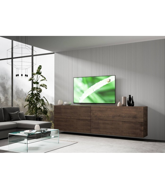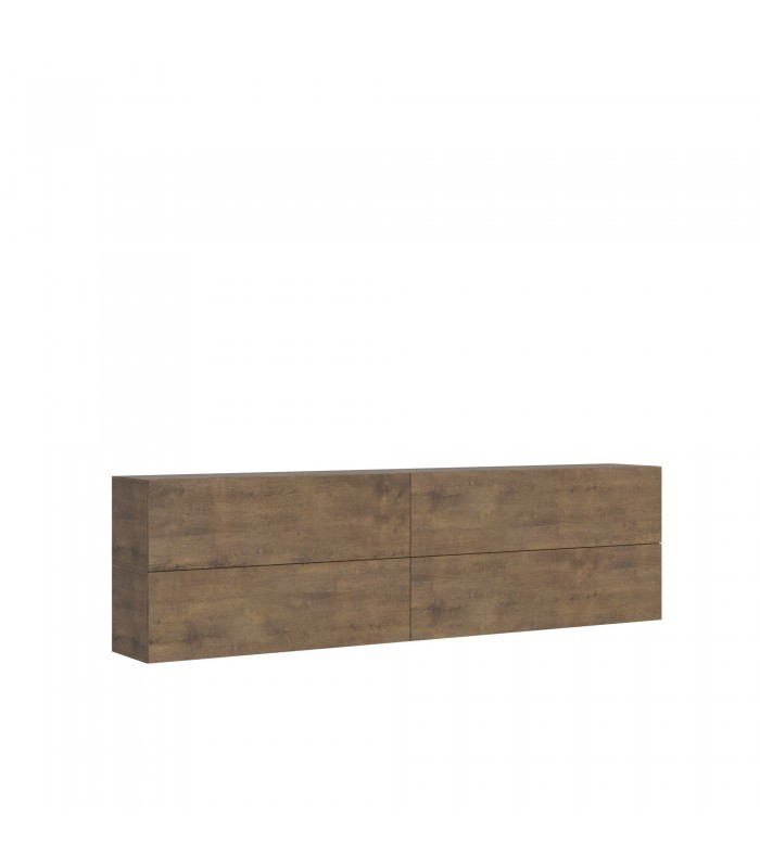 I quattro pensili orizzontali possono essere disposti in molteplici configurazioni: creando un'unica composizione compatta che ricorda un mobile TV tradizionale, oppure distribuendoli sopra e sotto il televisore, o ancora sparsi sulla parete per un effetto più contemporaneo e aerodinamico. La composizione in foto è solo un esempio: tu sei libero di creare la configurazione che preferisci.