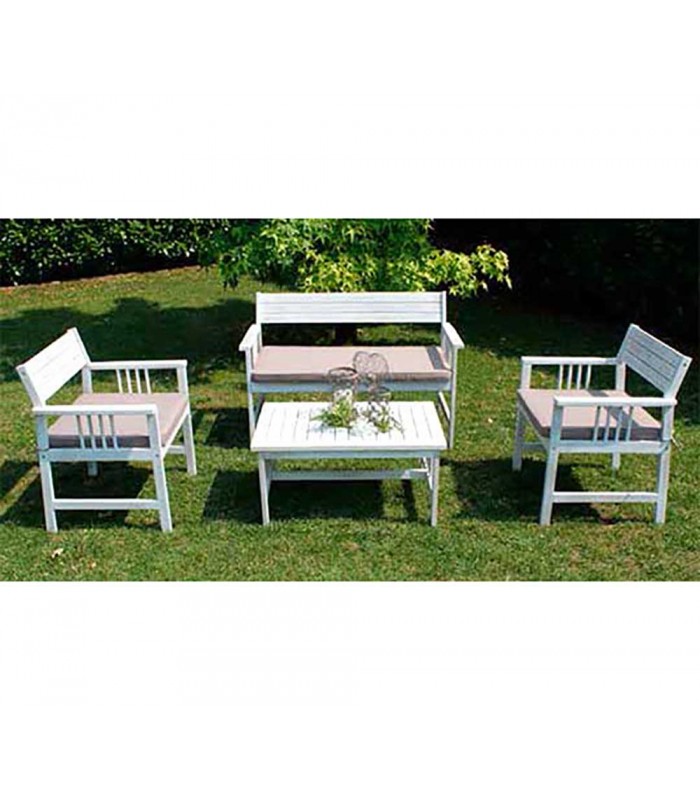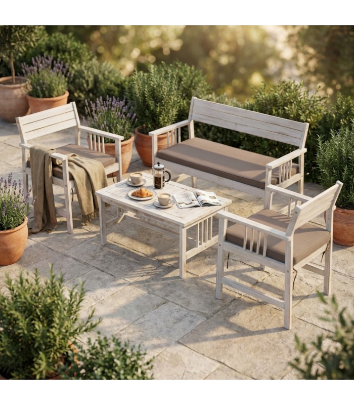 Elegante set salotto realizzato in legno massiccio di acacia, colore bianco, progettato per arredare il soggiorno con stile e comfort. Completo di 3 pezzi e cuscini tortora con spessore seduta 4 cm.