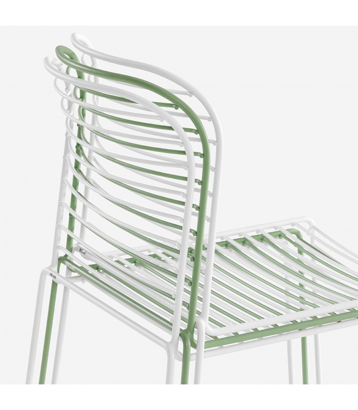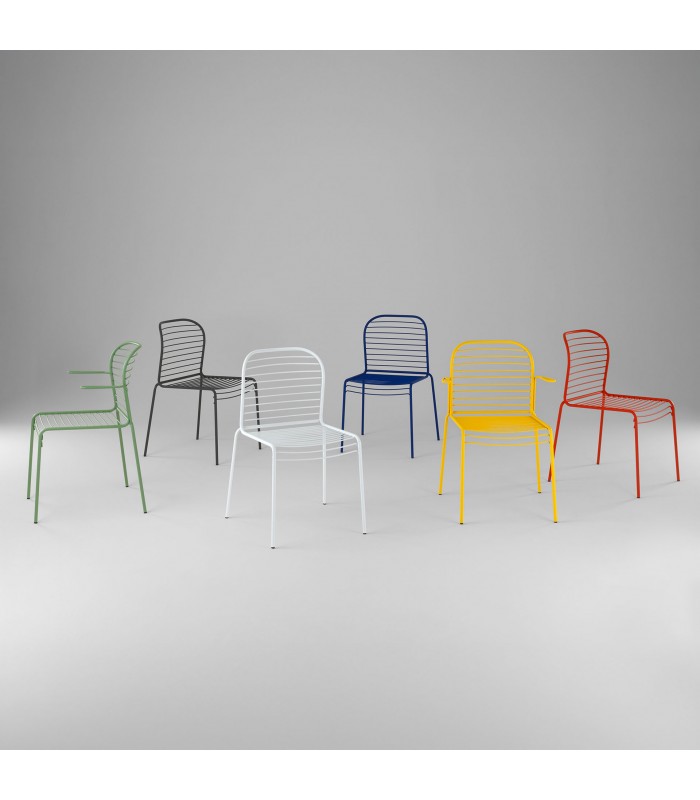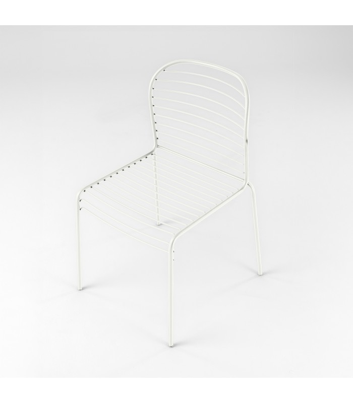 Realizzata in tondino di acciaio verniciato, la sedia Infinito si distingue per le linee pulite e il disegno grafico creato dalle doghe orizzontali di seduta e schienale.