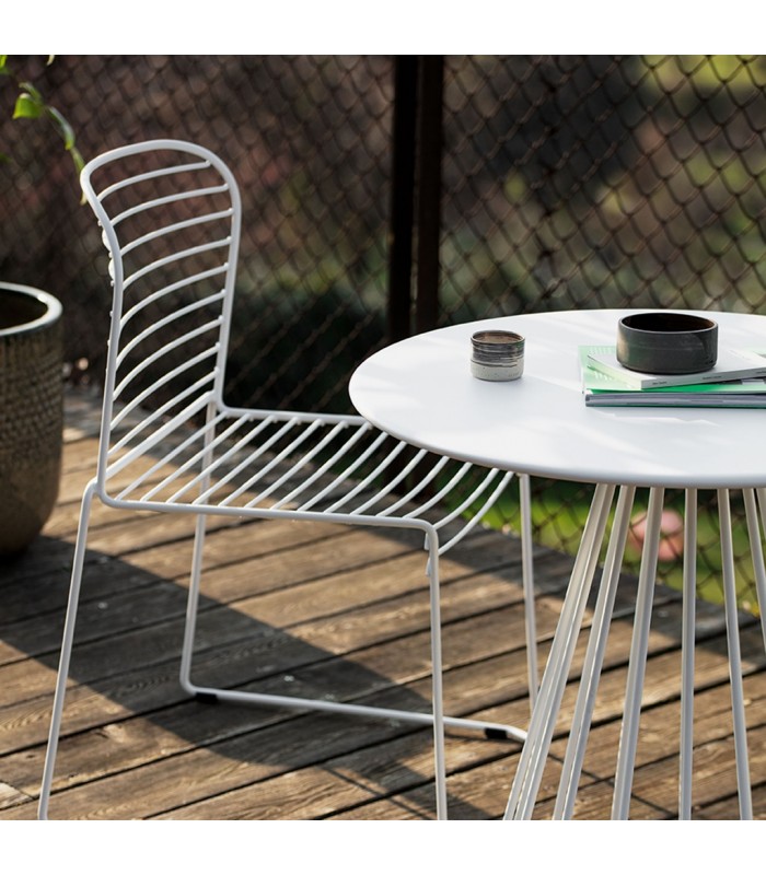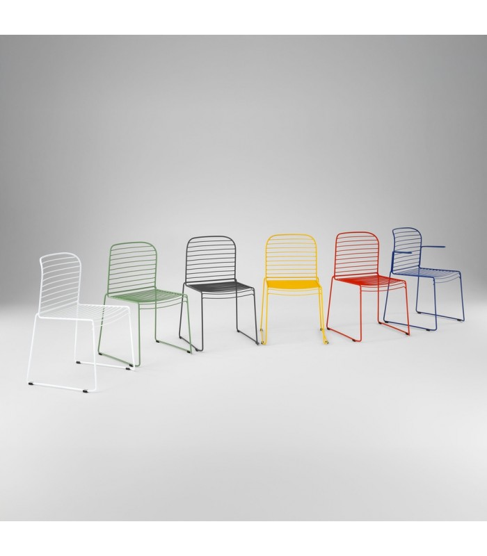 Realizzata in tondino di acciaio verniciato, la sedia Infinito si distingue per le linee pulite e il disegno grafico creato dalle doghe orizzontali di seduta e schienale.