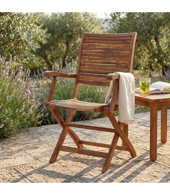 Poltrona Riviera con Braccioli in Legno di Acacia – eleganza, comfort e robustezza in un unico prodotto. Perfetta per arredare giardini, terrazzi, balconi o ambienti interni con stile naturale.